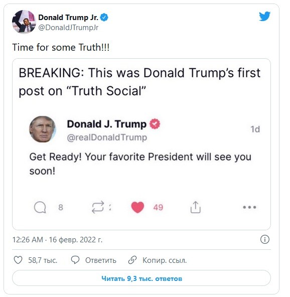 Что же касается бета-тестирования Truth Social, то в нём принимает участие и сам господин Трамп. Недавно его сын Дональд Трамп-младший (Donald Trump Jr.) опубликовал в своём твиттере скриншот первой публикации отца на новой платформе. Бывший президент сообщил: «Готовьтесь! Ваш любимый президент скоро увидит вас!». В Truth Social, по данным на вечер минувшей среды, у него 317 подписчиков, хотя перед блокировкой в Twitter его читали 88 млн пользователей популярнейшего сервиса микроблогов. Администрация нового сервиса не дала комментариев по поводу задержки открытия ресурса. Джерело: 3DNews.ru Обговорення новиниКоментариев пока никто не оставил. Станьте первым! Попередні новини