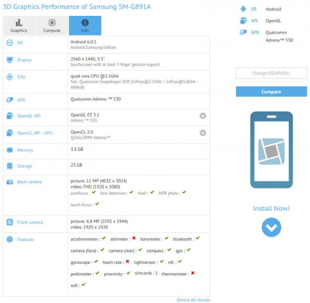 Защищенный флагман Samsung Galaxy S7 Active посетил GFXBenchНе представленный еще официально защищенный флагман Samsung Galaxy S7 Active прошел тестирование производительности в популярном бенчмарке GFXBench, благодаря чему стали известны его основные технические характеристики. Итак, по данным тестера, будущая новинка южнокорейского производителя получит 5.5-дюймовый Super AMOLE-дисплей с разрешением 2560х1440 пикселей, флагманский чипсет Qualcomm Snapdragon 820, 4 ГБ оперативной памяти и 32 ГБ встроенной, слот для карт памяти microSD и две камеры - 5Мп фронтальную и 12Мп основную.