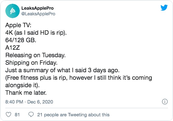 На прошлой неделе мы сообщали, что завтра, восьмого декабря, Apple может представить ряд новых продуктов, среди которых будут трекеры для поиска вещей AirTag и беспроводные наушники AirPods Studio. Согласно свежим утечкам, завтра калифорнийская компания может представить и новое поколение приставки Apple TV, которая будет основана на чипсете, как у актуального iPad Pro.