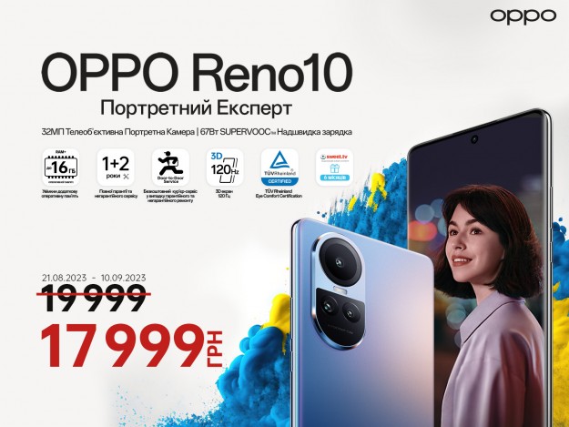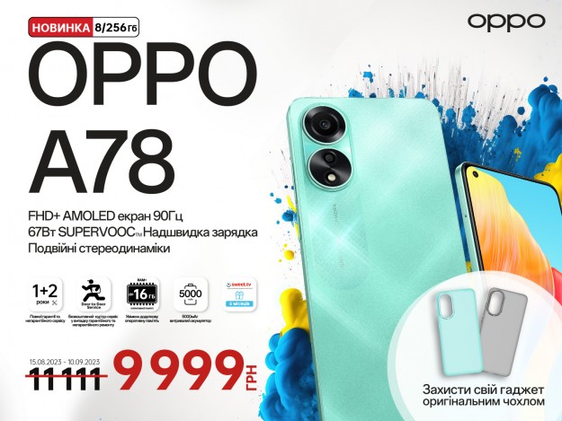 Смартфон ОРРО А78 (8/256 ГБ) пропонує подвійні стереодинаміки, блискавичну 67Вт SUPERVOOC зарядку і довговічний акумулятор ємністю 5000 мАг, а також безпечну операційну систему ColorOS 13.1. Це перший телефон серії A, оснащений 6,4-дюймовим FHD+ AMOLED дисплеєм з частотою оновлення 90 Гц і частотою дискретизації дотику до 180 Гц. ОРРО A78 оснащений системою камер, що включає 50 МП основну камеру та низку нових функцій, які полегшують фото та відео зйомку. Наприклад, інтелектуальні технології режиму Extra HD об'єднують кілька знімків в одну наддеталізовану фотографію максимальної чіткості з роздільною здатністю 108 Мп. Смартфон ОРРО A78 працює на мобільній платформі Snapdragon® 680 та має 8 ГБ оперативної пам'яті + 256 ГБ постійної пам'яті з можливістю встановлення до 1 ТБ додаткової пам'яті через слот для карт пам'яті SD. До того ж, смартфон має функцію розширення RAM до 16 ГБ (8+8 ГБ) за допомогою технології OPPO RAM Expansion. Звичайна ціна 11111 грн - Акційна ціна 9999 грн. (15/08-10/09) Також приємною новиною є те, що у продажу з’явились також оригінальні захисті чохли до ОРРО А78 та OPPO Reno10. Аксесуари виготовлені з надійних матеріалів, полікарбонату та термопластичного поліуретану. Вони вирізняються еластичністю, стійкістю до деформацій та розривів. Чохли не пожовтіють з часом, не змінюють колір, тому ідеально доповнюватимуть стиль телефона протягом тривалого часу.