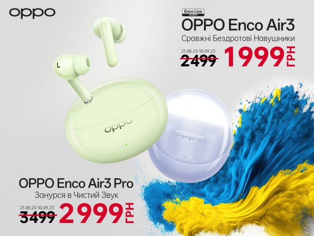 TWS навушники OPPO Enco Air3 оснащені технологією Bluetooth 5.3 та гарантують наднизьку затримку. Одного заряду вистачає на 6 годин прослуховування, а із зарядним кейсом можна слухати до 25 годин. OPPO Enco Air3 мають на 35% більшу енергоефективність, на 50% довший час автономної роботи та точніше відтворення звуку, ніж інші навушники аналогічного сегменту. Навушники працюють із високою потужністю, зберігаючи високий рівень музичних деталей завдяки 13,4-мм динамікам. ОРРО Enco Air3 оснащені модулем DSP і забезпечують довшу витривалість і кращу якість звуку, а також керують обробкою OPPO Alive Audio в самих навушниках для більш захоплюючого, тривимірного звучання. Звичайна ціна 2499 грн - Акційна ціна 1999 грн. (21/08-10/09) Звичайна ціна 3499 грн - Акційна ціна 2999 грн. (21/08-10/09) Перелік акційних товарів надзвичайно привабливий, адже OPPО AED Україна пропонує суперціни й на інші гаджети-бестселери: