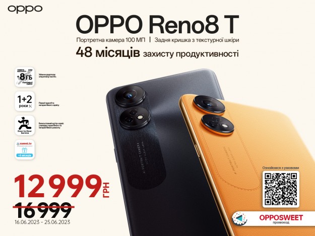 Зустрічай літні канікули з ОРРО- купуй гаджети зі знижкамиСкінчився важкий навчальний рік і розпочинаються довгоочікувані літні канікули. ОРРО AED Україна оголошує знижки на цілий ряд смартфонів і гаджетів бренду, щоб кожен охочий міг обрати подарунок школяру та нагородити його за жагу до навчання та витримку. Це чудова нагода віддячити своїй дитині за рік важкої праці у надскладних умовах. Смартфон ОРРО Reno8 Т (8/128 ГБ) -перший смартфон Reno серії, що працює на надпотужному 6-нанометровом процесорі Mediatek Helio G99 та який може похизуватись 100 Мп портретною камерою у парі з 32 Мп селфі-камерою та 2 Мп мікролінзою з 20- або 40-кратним збільшенням. Крім того, смартфон має екран з частотою оновлення 90Гц, що знижує навантаження на очі. Пило- та водонепроникна конструкція OPPO Reno8 T має клас захисту IP54, що означає, що ваш смартфон захищений від попадання пилу та інших частинок всередину. Завдяки акумулятору високої місткості на 5000 мАг та 33Вт SUPERVOOCTM технології заряджання, ОРРО Reno8 T може зарядитись до 100% за 67 хвилин. Що стосується потужності, смартфон має функцію розширення RAM до 16 ГБ (8+8) ГБ за допомогою технології OPPO RAM Expansion. Звичайна ціна: 16 999 грн. Акційна ціна (16/06-25/06): 12 999 грн