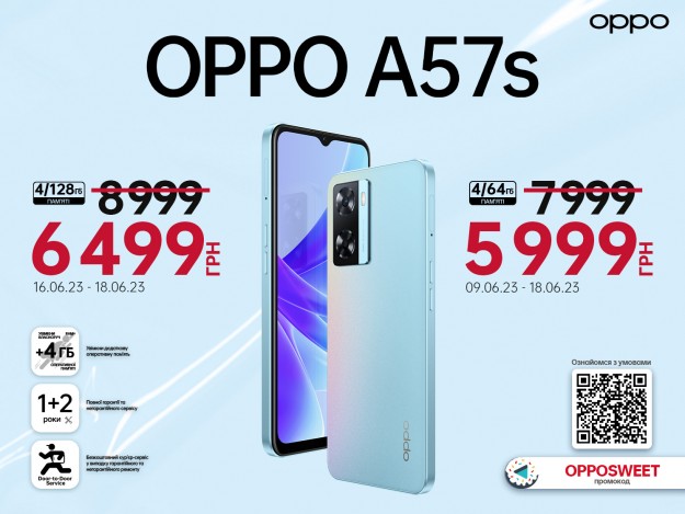 Смартфон ОРРО А57s оснащений потужним акумулятором на 5000 мАг та провідною швидкою 33Вт SUPERVOOC зарядкою. Крім того смартфон має ультралінійні динамікі з технологією автоматичної оптимізації звуку Dirac. ОРРО А57s може похизуватись 50 Мп АІ основною камерою та 8 Мп фронтальною камерою. Модель оснащена технологією RAM+, яка дає змогу збільшити RAM на 4 ГБ. Звичайна ціна (4/128 ГБ): 8 999 грн. Акційна ціна (16/06-18/06): 6 499 грн