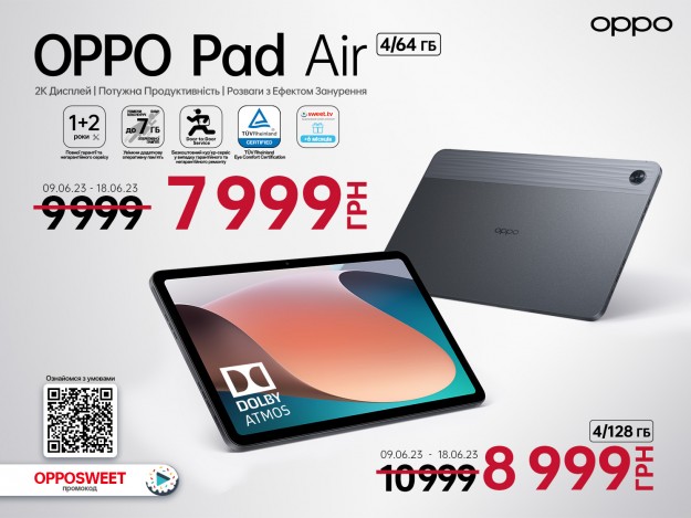 Планшет OPPO Pad Air працює на базі мобільної платформи Qualcomm Snapdragon® 680. OPPO Pad Air оснащений 10,36-дюймовим 2K HD дисплеєм з сертифікатом T?V Rheinland, а також чотирма надвеликими динаміками з Dolby Atmos. Планшет має великий акумулятор ємністю 7100 мАг і працює під керуванням ColorOS for Pad. Користувачі можуть легко збільшити об’єм оперативної пам’яті OPPO Pad Air до 7 Гб, використовуючи технологію OPPO RAM Expansion та запозичивши до 3 ГБ невикористаної ПЗУ. Звичайна ціна (4/128 ГБ): 10 999 грн. Акційна ціна (09/06-18/06): 8 999 грн