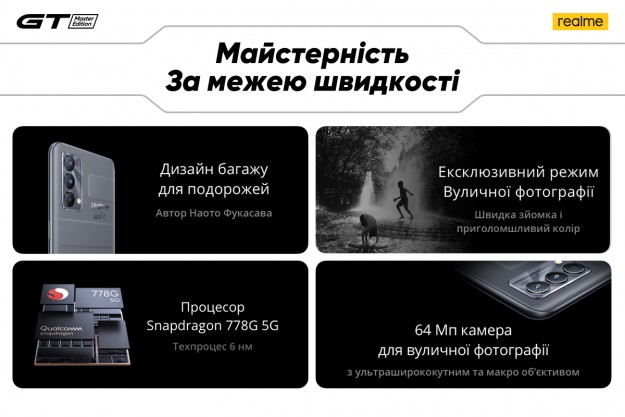 ривлекательный облик смартфона сочетается с мощностью, идеально подходящей для творчества и исследования окружающего мира. realme GT Master Edition принадлежит к флагманской серии realme GT, отличающейся высокой производительностью и задающей тренды дизайна. Официальный запуск продаж смартфона на территории Украины - 11 ноября. «Искусство за пределами скорости» В дизайне не обошлось без смелой идеи. Производитель использовал трехмерную веганскую кожи собственной разработки realme. realme GT Master Edition уже получил своего рода «Оскар» в мире дизайна – премию iF Design Award, и этого стоило ожидать: разработкой внешнего вида устройства занимался японский индустриальный дизайнер-минималист Наото Фукасава, известный во всем мире автор, работы которого выставляются в Музее современное искусство в Нью-Йорке. Приступая к разработке дизайна той или иной модели, realme часто задает основную тему и в этот раз ею стала тема путешествий. Наото проникся этой идеей: он не только придал корпусу отделку из искусственной кожи, но и придал уникальную форму, которая роднит ее со стильным чемоданом. Использованная в покрытии кожа – на 100% веганская, полученная без причинения вреда животным и созданная из экологически чистых материалов. И это не только стилистическое решение, поскольку такой девайс отлично лежит в руке. Что касается цвета, то серый – это модная тенденция, которую часто можно встретить в повседневной одежде законодателей моды. Однако в серии GT Master Edition не все смартфоны похожи на чемодан: есть версия с обычным дизайном в перламутровом исполнении. Спинка матовая, не скользкая и на ней не видно отпечатков пальцев, а значит, выглядит очень солидно.