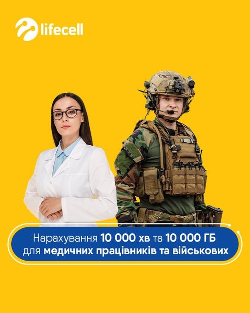 Медичні працівники та військові мають бути на зв'язку! Абонентам lifecell, які працюють у цих сферах, ми нараховуємо 10 000 хвилин для дзвінків на всі номери по Україні та 10 000 ГБ до 31.05.2022 включно. Ви отримаєте СМС-повідомлення про нарахування. Для перевірки: *121# Підтримуємо наших героїв! Слава Україні! Джерело: SmartPhone.ua Обговорення новиниКоментариев пока никто не оставил. Станьте первым! Попередні новини