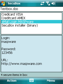 MASPware SecuBox — позволяет хранить любой текст или двоичный код в кодировке Triple-DES (используется в банковских системах). Все упаковывается и хранится в одном файле данных, который может быть сохранён на карте памяти.