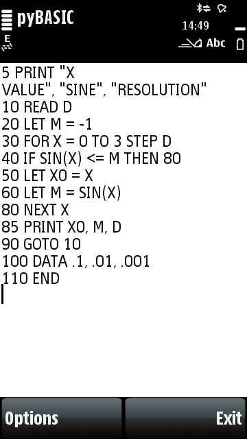 Программа pyBasic представляет собой интерпретатор языка BASIC для Вашего смартфона. С помощью этой утилиты Вы сможете запускать программы с расширением bas, которые должны лежать в папке x:/data/pybasic/bas.