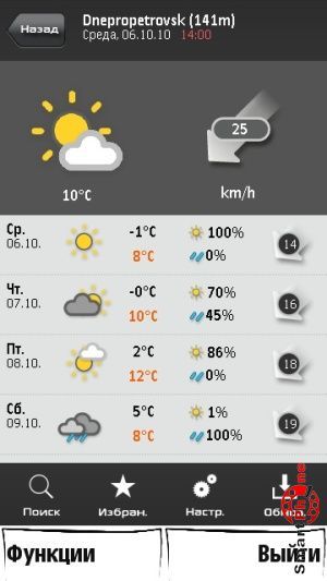 Программа MeteoNews представляет собой утилиту, которая отображает текущую погоду и прогноз на ближайшие 10 дней. В программе имеются возможности поиска городов и автоопределение по GPS. Нужные места можно занести в список избранных прогнозов.