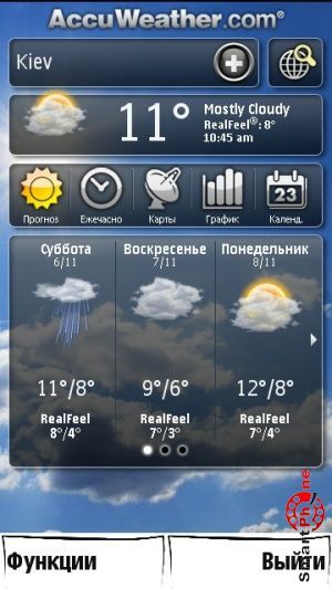 Программа AccuWeather представляет собой качественный и функциональный виджет, предназначенный для просмотра погоды. Утилита покажет текущую погоду, возможное ухудшение погодных условий в ближайшие несколько часов, сведения об ожидаемых осадках вперед на несколько дней, температуру и состояние неба на следующие сутки, прогноз погоды днем и ночью на неделю, почасовой прогноз погоды на 15 часов...