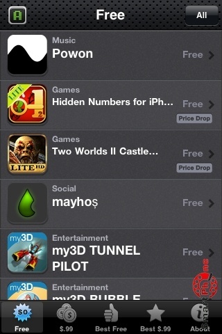 Приложение App-Free является каталогом бесплатных и уцененных приложений. Регулярное обновление перечня предложений позволяет быть в курсе всех акций и скидок на приложения. Программа сортирует приложение на бесплатные и стоимостью $0.99 (это минимальная цена в App Store).