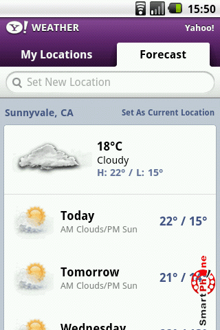 Программа Yahoo! Погода представляет собой утилиту для отображения прогноза погоды прямо на экране смартфона. Имеется возможность следить за бурями, просматривать текущие погодные условия и прогнозы на 10 дней, получать данные о погоде, включая ветер, видимость или влажность, в разных городах мира или там, где вы находитесь.