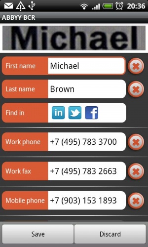 ABBYY Business Card Reader позволяет переносить данные с визитных карточек в адресную книгу мобильного устройства при помощи встроенной фотокамеры и технологии оптического распознавания от ABBYY. С его помощью вы также сможете найти дополнительную информацию о новом контакте в Интернете.