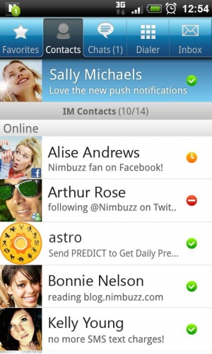 Nimbuzz является уникальным продуктом, который позволяет бесплатно общаться во всех популярных протоколах (позволяет одновременно общаться с клиентами Windows Live Messenger (MSN), Yahoo, ICQ, AIM, Google Talk, социальными сетями Facebook, MySpace, Twitter.). Все ваши контакты будут находиться в одном списке, в одном приложении!