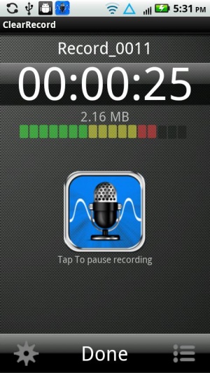 Программа ClearRecord способна подавлять окружающий шум, случайно захваченный во время записи на диктофон. На главном экране будет отображаться одна большая кнопка "запись / стоп". Есть возможность быстрого воспроизведения последней записи. Может записывать бекграундом, если поверх открыто другое приложение.