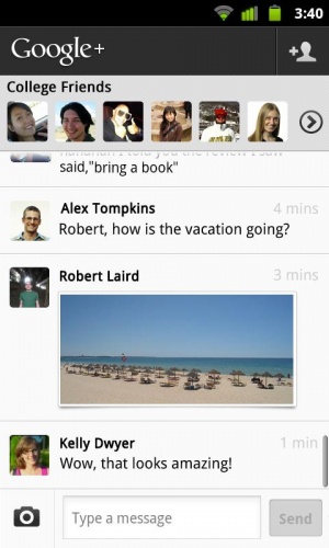 Google+ — социальное приложение для обмена информацией на Android.. ри помощи программы можно обмениваться текстовыми сообщениями, загружать фотографии и видео, сделанные при помощи камеры устройства, на удаленный сервер и делиться ими с друзьями, просматривать местоположения друзей, а также читать обновления из лент других пользователей Google+.