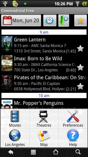 Cinemadroid - это программа которая поможет вам не пропустить не одной премьеры фильмов в кинотеатрах. Данная программа покажет ближайшие сеансы фильмов в вашем городе,так же программа может отобразить в вашем устройстве на OS Android сеансы на 7 дней вперед. Программа отображает кинотеатры 12 городов в том числе и Российские.