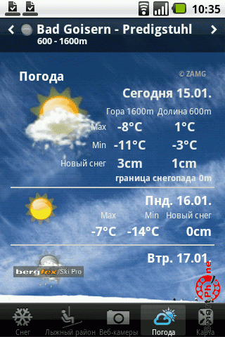 Приложение bergfex/Ski Lite представляет собой инструмент, отображающий информацию о горнолыжных курортах, прогнозе погоды, включающим информацию о осадках в виде снега. Кроме всего прочего имеется возможность просмотра видео с онлайн веб камер (если таковые установлены) и картинки того или иного лыжного курорта.