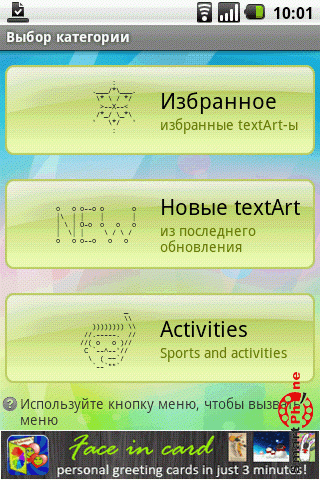 Приложение Символьная клавиатура & TextArt представляет собой единственную символьную клавиатуру и наиболее функционально богатое text art приложение. С помощью этого софта вы сможете отправлять символы или text art из каталогов программы на фейсбук, вконтакт, смс, почту, твитер или блог... Вы можете также создать свой собственный text art.