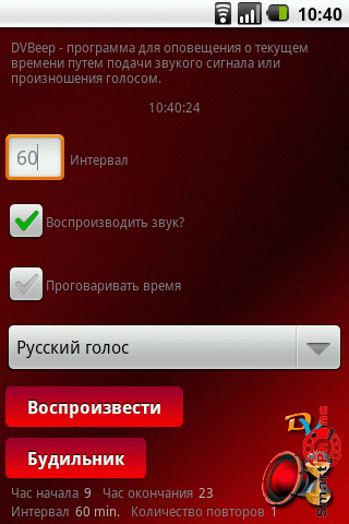 Приложение DVBeepPro представляет собой говорящие часы или часовой бипер. Назначение программы: оповещать о текущем времени голосом или звуковым сигналом, когда нет возможности смотреть на часы.