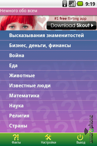 Приложение Немного обо всем представляет собой утилиту, в которой представлены самые интересные факты из различных категорий: человек, животные, физика, математика, страны мира, животные, обычаи мира... С помощью этой программы вы сможете расширить свой кругозор и блеснуть перед знакомыми познаниями...
