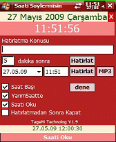 Программа каждый час или каждые 30мин подает сигнал и оповещает время голосом. Также, время можно прослушать нажав соответствующую кнопку.