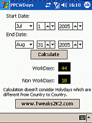 Простая программа для подсчета рабочих дней между двумя датами. Праздники не учитываются.