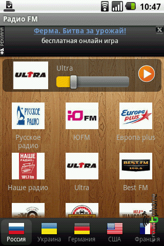 Приложение Радио FM представляет собой интернет радио, содержащее в себе 150 радиостанций со всего мира. В списке стран присутствуют Россия, Украина, Германия, США, Франция...