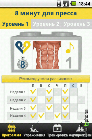 Приложение 8 минут для пресса представляет собой сборник упражнений для тренировки мышц живота. Утилита содержит оптимальное временное планирование для определённого типа тренировки с рекомендацией сколько раз в неделю, и на сколько недель, вы должны продолжать тренировки, чтобы перейти на следующий уровень.