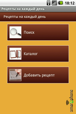 Приложение Рецепты на каждый день представляет собой сборник универсальных рецептов приготовления блюд. Все рецепты разделены на 9 категорий: салаты, супы, вторые блюда и блюда из говядины, свинины, курицы, рыбы, блюда без мяса и десерты. Для каждого рецепта указана калорийность на одну порцию, количество белков, жиров и углеводов. Имеется возможность добавлять свои рецепты в базу программы.
