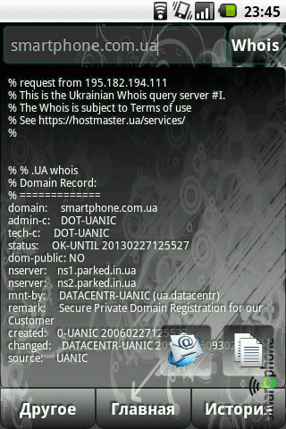 Приложение WhoisInfo представляет собой домен сервис, предназначенный для получения данных по именам доменов в сети интернет. С помощью этой программы вы можете узнать много полезной информации, например адреса и телефоны администрации, название организации или имя лица которым принадлежит доменное имя.