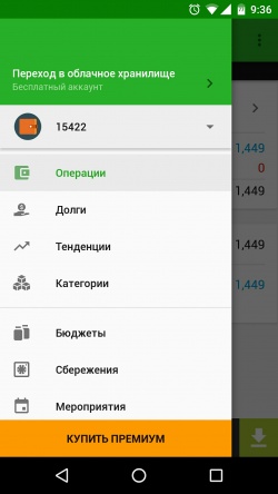 Все операции в программе группируются по кошелькам. Так, например, можно просмотреть информацию о собственно операциях, долгах, тенденции и категории.