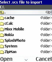 Import - с помощью этой функции, которая также как и предыдущая дублирует функцию главного меню программы, мы можем осуществлять передачу файлов данных календаря с нашего смартфона на другое устройство. При этом передача проходит не автоматически, как в предыдущей функции, а мы сами выбираем данные из появившегося каталога памяти смартфона: