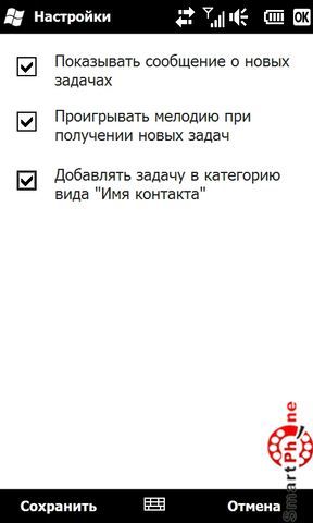 В меню "Настройки" производятся действия облегчающие работу с приложением, можно включить функцию отображения новых задач, проигрывание мелодии.