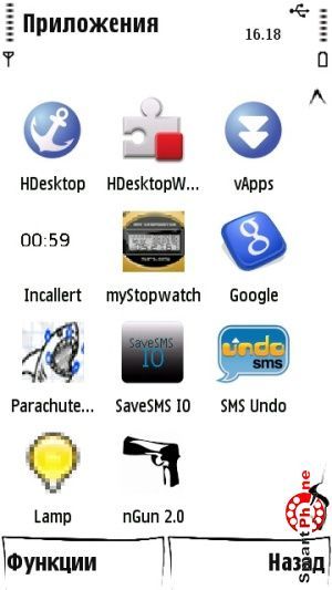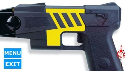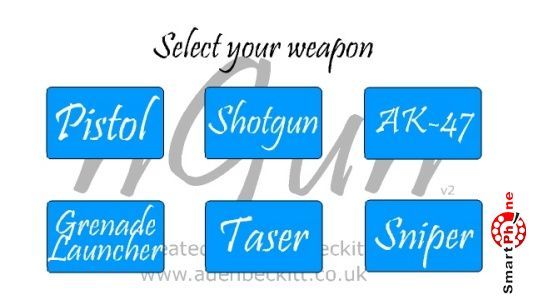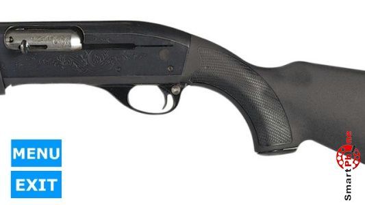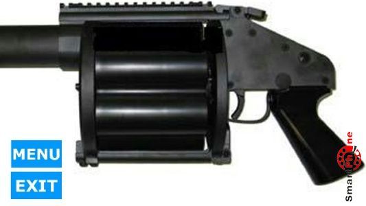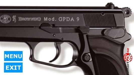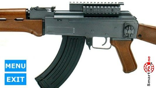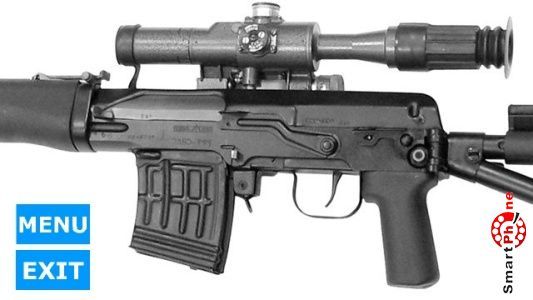 В левом нижнем углу экранного табло с имитацией оружия размещены две функциональные клавиши, позволяющие переходить в главное меню программы и выходить из программы в главное меню нашего смартфона.