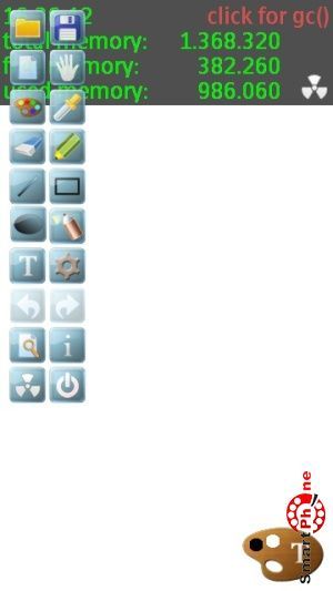 Также в панели инструментов присутствуют функциональные клавиши, позволяющие просматривать информацию о состоянии дисков памяти смартфона, информацию о данной версии программы и её разработчиках, переходить в полноэкранный режим просмотра изображения и выходить из программы в главное меню нашего смартфона: