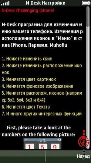 Программа N-Desk представляет собой рабочий стол для телефонов нокиа. Основными особенностями данного рабочего стола являются горизонтальная прокрутка и возможность настройки цвета фона и обоев.