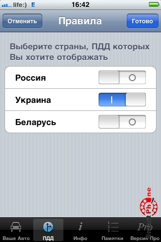 Мы рассмотрели вкладку "Ваше Авто". Перейдем ко вкладке "ПДД", которая содержит правила дорожного движение России, Украины и Белоруссии, дорожные знаки и разметки и т.д.