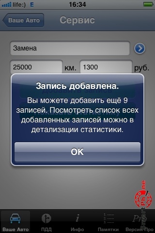 Нажав на строку "Стоимость обслуживания", можно ввести наименование и стоимость работ или покупок и пробег. Статистика ведется с ограничением в 10 записей. Нажмите на стрелочку, чтобы оставить комментарий.