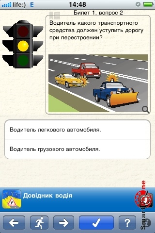 Интерфейс программы прост и удобен. Приложение состоит из 50-ти билетов, по 20 вопросов в каждом. Светофор переключается на зеленый цвет в случае правильного ответа, желтый - ожидание ответа и красный цвет указывает на неправильный вариант. Необходимо выбрать правильный ответ и нажать галочку.