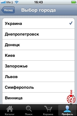Главное вкладка приложение содержит каталог товаров, отсортированных по категориям. Для сортировки результатов по вашему городу и возможности совершать покупки из приложения, необходимо зарегистрироваться. Для этого нажмите на строку "Украина".
