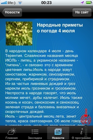 Вкладка "Новости" содержит последние новости о погоде и мире. Нажмите на название новости, чтобы перейти к подробному описанию.