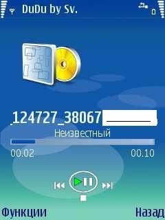 Записи - данный режим представляет собой список записей наших телефонных разговоров (отображен на представленном выше скриншоте). Возле каждой записи отображен телефонный номер абонента, с которым мы вели разговор, время записи, время в которое была осуществлена запись... Прослушать запись телефонного разговора мы можем нажав на ней джойстиком нашего смартфона, в следствии чего появляется проигрыватель звуковых файлов и осуществляется воспроизведение: