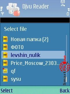 • Open File - с помощью этой функции мы можем осуществлять ручной поиск файлов формата Djvu на дисках памяти нашего смартфона и открывать их. Не понравился тот факт, что Djvu файлы ничем внешне не отличаются от файлов других форматов в поисковом каталоге. Именно из-за этой недоработки разработчиков очень сложно определится где Djvu файлы, а где файлы других форматов. Если же мы выбираем ошибочно файлы других форматов, нас просто "выбивает" из программы в главное меню смартфона: