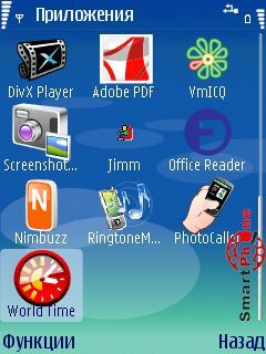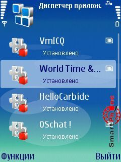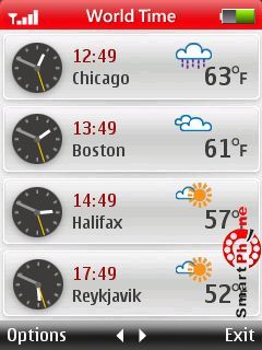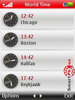 Интерфейс главного меню программы довольно стильно оформлен и представлен пользователю списком городов мира с соответствующим им временем (как в виде циферблата, так и в цифровом варианте) и прогнозом погоды (в виде показателя уровня температуры и облачности). Перемещение по списку мы можем осуществлять с помощью джойстика нашего смартфона. Над всей этой красотой, вверху отображены уровень сети, название программы и уровень заряда батареи смартфона.