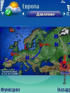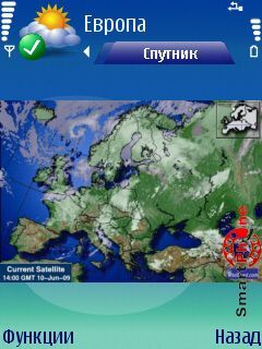 Показать - с помощью этой функции мы можем переключиться на отображение погоды текущего дня, текущего времени суток, а также на карты температуры, давления и спутников. Для пользования картами их необходимо предварительно загрузить с сети интернет: