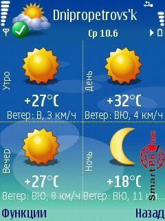 прогноз; текущее состояние погоды; пятидневный график температур и осадков; программа содержит скринсейвер с погодой с поддержкой
