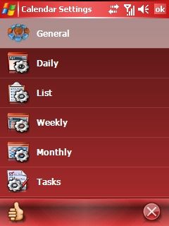 Запуск приложения можно осуществить процессом перехода в меню "Пуск - Программы" и запустить приложения нажав на иконку, второй способ запустить приложение в плагине "Сегодня". Рабочее пространство приложение организовано таким образом, что все управляющие кнопки находятся в низу, а вся рабочая часть зарезервирована за календарем. Так первая кнопка открывает меню с выбором оформления рабочего пространства, можно выбрать: (ежедневно, еженедельно, ежемесячно, список).