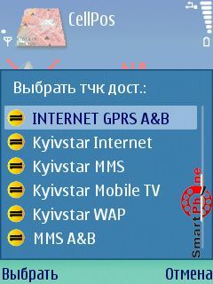 Загрузить в сервер - с помощью этой функции мы можем загрузить в сервер считываемые нашим GPS данными (собственно это своеобразные отчеты). Для загрузки данных нам необходимо выбрать точку доступа в сеть: