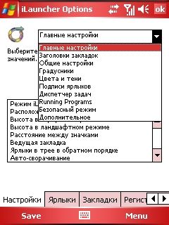 В меню настроек выбирается пункт настроек для изменения его: главные настройки, заголовки закладок, общие настройки, градусники, цвета и тени, подписи ярлыков, диспетчер задач, безопасный режим, дополнительное. Для начала рассмотрим главные настройки в которых: режим iLauncher - можно выбрать количество закладок и их расположение (по горизонтали или вертикали), расположение значков - расставление и выбор по ширине, высота в портретном режиме - здесь выбирается высота значков которые будут отображаться на экране "Сегодня", расстояние между значками - для удобства чтобы можно видеть названия значков и т.д.